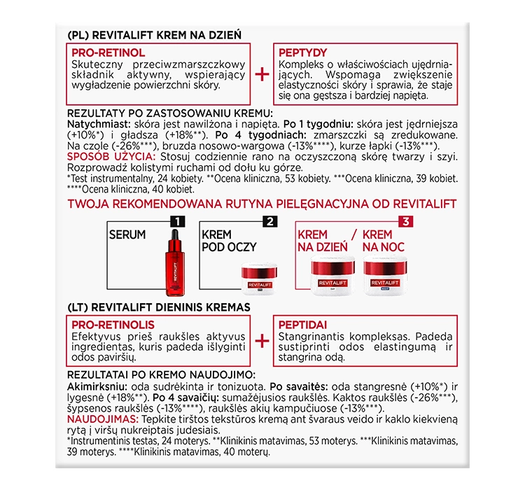 Pro-Retinol ist der Schlüsselbestandteil der Revitalift Gesichtscreme. Dieser Inhaltsstoff wirkt vielseitig, indem er die Haut glättet und sichtbare Zeichen der Hautalterung reduziert. Dank ihm wird die Hautstruktur glatter und gleichmäßiger, während Falten weniger sichtbar werden. Darüber hinaus wirkt Pro-Retinol intensiv an der Hautoberfläche und verleiht ihr einen jugendlichen Glanz.