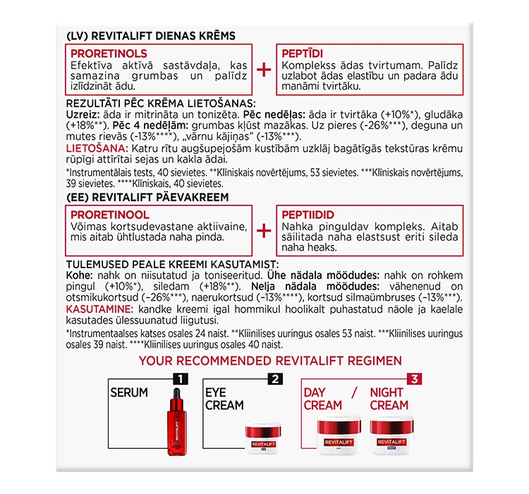 Die L'Oréal Paris Revitalift Tagescreme wirkt auf mehreren Ebenen und bietet sowohl sofortige als auch langfristige Ergebnisse. Schon nach der ersten Anwendung erhält die Haut einen gesunden Glanz und wirkt gestrafft. Nach einer Woche wird sie deutlich fester und ihre Struktur erscheint glatter. Nach vier Wochen sind Falten auf der Stirn, im Augenbereich und um den Mund herum deutlich reduziert.