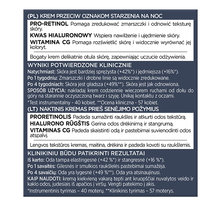 Klinische Studien bestätigen die Wirksamkeit der Revitalift Laser Nachtcreme von L'Oréal Paris. Bereits nach der ersten Anwendung ist die Haut sichtbar mit Feuchtigkeit versorgt. Nach einer Woche werden Falten, wie Zornesfalten oder Krähenfüße, um mehrere Prozent reduziert. Nach vier Wochen regelmäßiger Anwendung wirkt der Teint strahlender, die Haut fester, und Zeichen der Hautalterung werden gemildert.