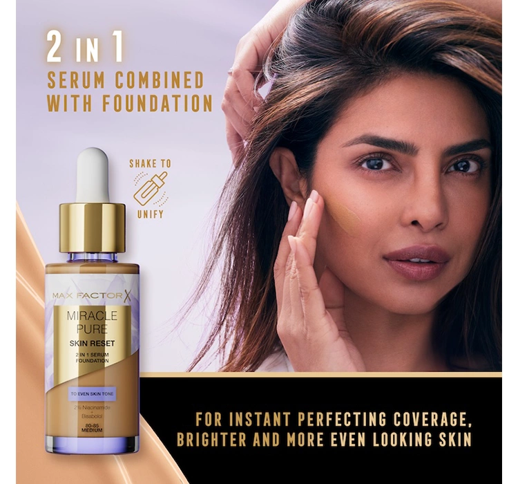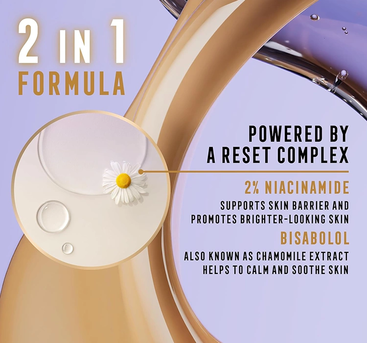 Die Foundation Max Factor Miracle Pure Skin Reset 2-in-1 Serum Foundation enthält zwei wichtige aktive Inhaltsstoffe: Bisabolol und Niacinamid, die sich positiv auf das Aussehen und die Beschaffenheit der Haut auswirken. Bisabolol unterstützt den natürlichen Feuchtigkeitsgehalt der Haut, wirkt beruhigend und reduziert Reizungen und Rötungen. Niacinamid (Vitamin B3) hilft hingegen, Farbunterschiede und Unregelmäßigkeiten im Hautton aufzuhellen, was zu einem einheitlichen Hautbild beiträgt.