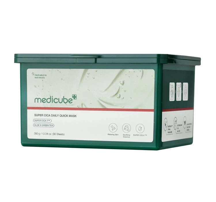 Medicube Super Cica Daily Quick Mask ist ein Set beruhigender Tuchmasken, entwickelt für die tägliche Pflege empfindlicher, trockener und gereizter Haut. Jede Maske ist mit einer reichhaltigen Essenz getränkt, die beruhigt, regeneriert und intensiv mit Feuchtigkeit versorgt – ideal für die tägliche Pflegeroutine oder als schnelle Hilfe für müde Haut.
