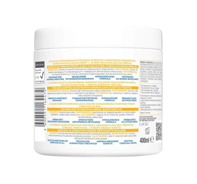Die Formel enthält drei aktive Inhaltsstoffe: Niacinamid (Vitamin B3-Derivat) unterstützt die Aufhellung von Pigmentflecken und verbessert die Hautstruktur. Vitamin Cg, ein stabiles Vitamin-C-Derivat, verleiht der Haut Strahlkraft und Energie. Sheabutter nährt intensiv, stärkt die Hautbarriere und stellt Komfort für sehr trockene Haut wieder her. Zusammen sorgen diese Inhaltsstoffe für ein gleichmäßiges, gesundes Hautbild und Geschmeidigkeit.