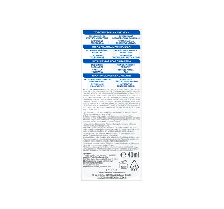 Inhaltsstoffe / Ingredients: AQUA / WATER • ALCOHOL DENAT. • DIISOPROPYL SEBACATE • SILICA • ISOPROPYL MYRISTATE • ETHYLHEXYL SALICYLATE • ETHYLHEXYL TRIAZONE • BIS-ETHYLHEXYLOXYPHENOL METHOXYPHENYL TRIAZINE • BUTYL METHOXYDIBENZOYLMETHANE • GLYCERIN • PROPANEDIOL • C12-22 ALKYL ACRYLATE/HYDROXYETHYLACRYLATE COPOLYMER • NIACINAMIDE • DROMETRIZOLE TRISILOXANE • PERLITE • CAPRYLIC/CAPRIC TRIGLYCERIDE • ZINC PCA • SARCOSINE • TRIETHANOLAMINE • TEREPHTHALYLIDENE DICAMPHOR SULFONIC ACID • SILICA SILYLATE • SALICYLIC ACID • SODIUM PHOSPHATE • TOCOPHEROL • DISODIUM PHOSPHATE • CAPRYLYL GLYCOL • HYDROXYETHYLCELLULOSE • TRISODIUM ETHYLENEDIAMINE DISUCCINATE • ACRYLATES/C10-30 ALKYL ACRYLATE CROSSPOLYMER • POLYSORBATE 60 (F.I.L. Z70062941/2).