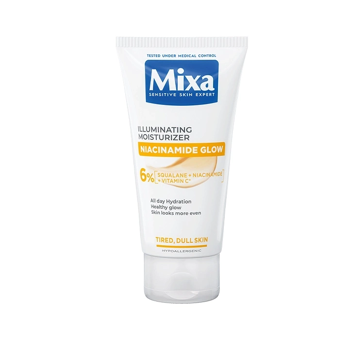 Die aufhellende Gesichtscreme Niacynamide Glow der Marke Mixa hat eine leichte Textur. Sie klebt nicht und hinterlässt kein Fettgefühl auf der Haut. Es eignet sich hervorragend als eine Basis für Make-up. Das Produkt ist hypoallergen und wurde auch auf empfindlicher Haut getestet.