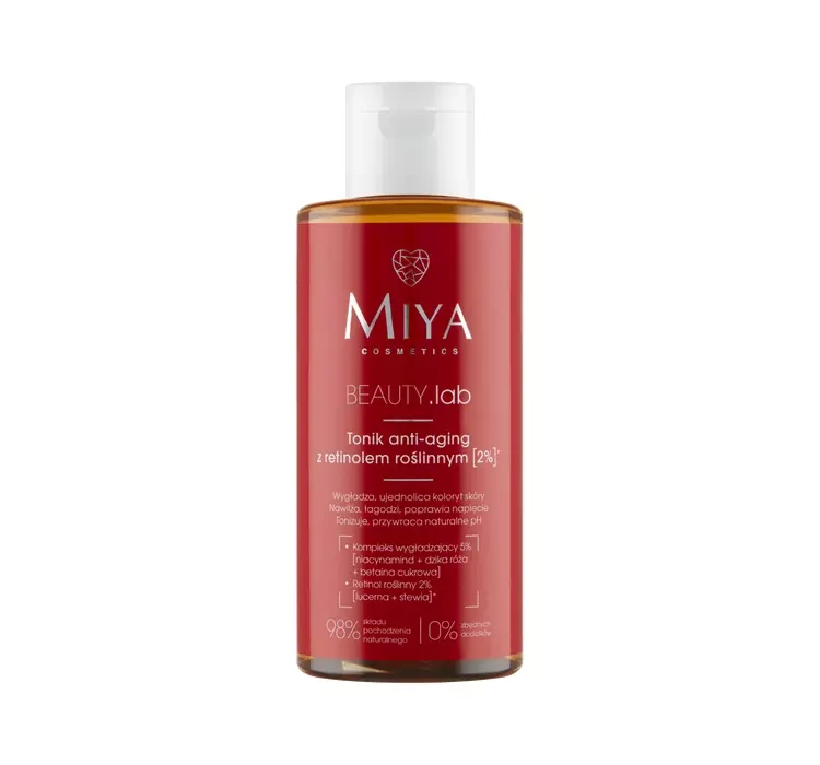 Miya Cosmetics BEAUTY.lab ist eine Reihe spezialisierter Gesichtspflegekosmetik. Ihre Formeln enthalten höhere Konzentrationen an wertvollen Wirkstoffen. Die Produkte wirken in viele Richtungen – sie verbessern effektiv das Aussehen und den Zustand der Haut. Das Tonikum mit pflanzlichem Retinol besteht zu 98% aus natürlichen Inhaltsstoffen und zu 0% über unnötige Zusatzstoffe.