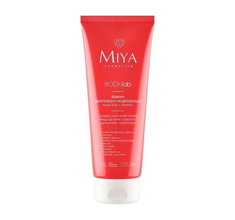 Miya Cosmetics BODY.lab Körperbalsam zeigt starke straffende und glättende Eigenschaften. Seine Formel wurde mit AHA-Säuren und Vitaminen angereichert. Die Mischung aus Glykolsäure und Milchsäure reduziert die Sichtbarkeit von Unvollkommenheiten und pflegt auch die Haut mit Anzeichen von follikulärer Keratose. Die Vitamine E, PP und Provitamin B5 wirken feuchtigkeitsspendend und erweichend. Sie reduzieren die Rauheit der Haut und stärken ihre Schutzbarriere.