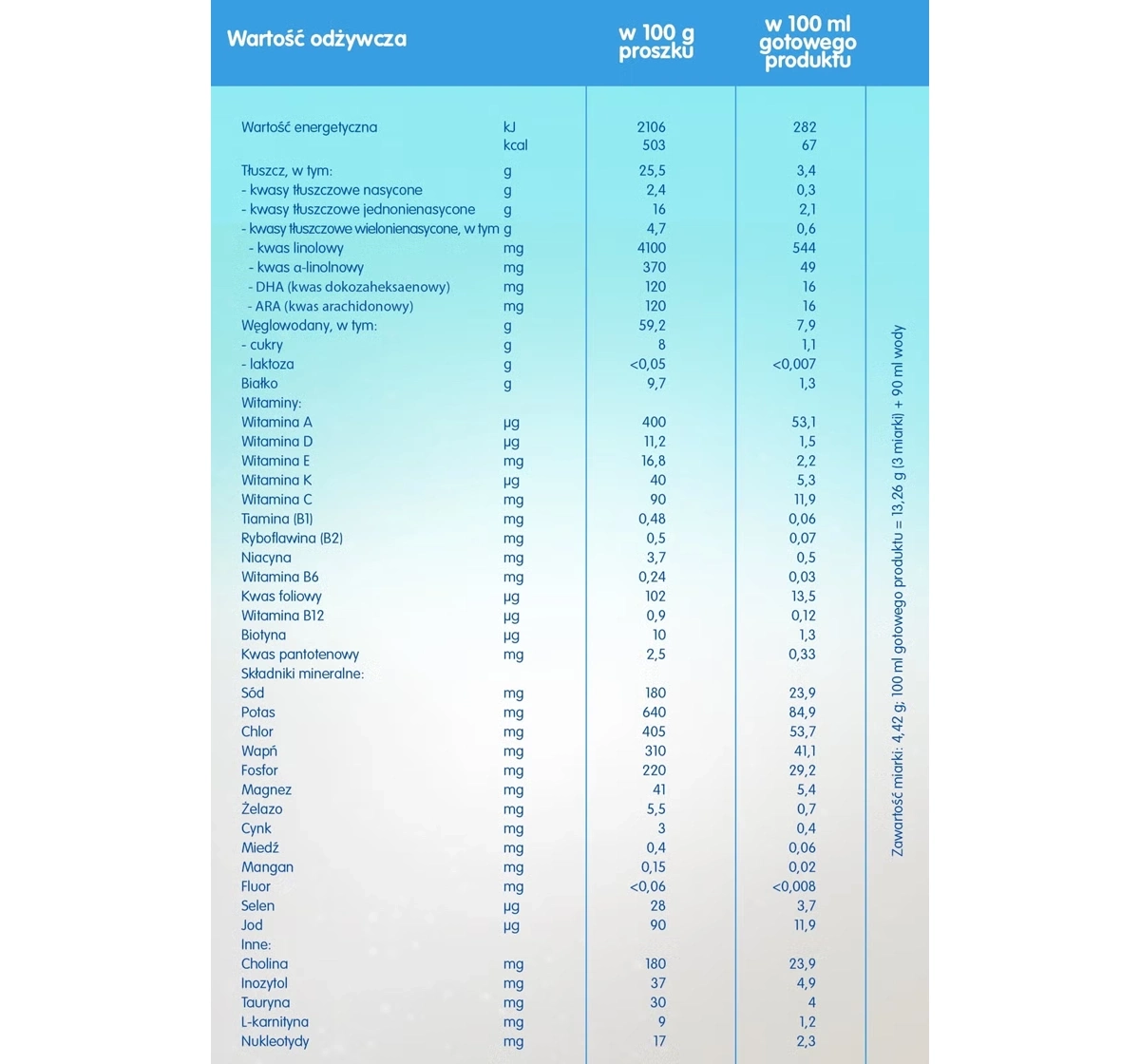 Ingredients: Glukosesirup, pflanzliche Öle (Sonnenblumenöl, Rapsöl), Molkenproteinisolat (aus Milch), Kaliumkaseinat (aus Milch), Milchproteine, Calciumcitrat, Kaliumchlorid, Emulgator [Lecithine (aus Soja)], Natriumphosphat, Fischöl, Weinsäurecholin, Öl aus Mortierella alpina, Kaliumcitrat, Säureregulator (Zitronensäure), L-Phenylalanin, Vitamine (C, E, Niacin, Pantothensäure, B1, A, B2, B6, Folsäure, K, D, Biotin, B12), Magnesiumoxid, Bakterienkulturen L. Limosilactobacillus reuteri (DSM 17938*), L-Histidin, Taurin, L-Tryptophan, Eisensulfat, Inosit, L-Carnitin, Zinksulfat, Nukleotide, Kupfersulfat, Mangansulfat, Kaliumjodid, Natriumselenat. *gemäß Lizenz von BioGaia AB
