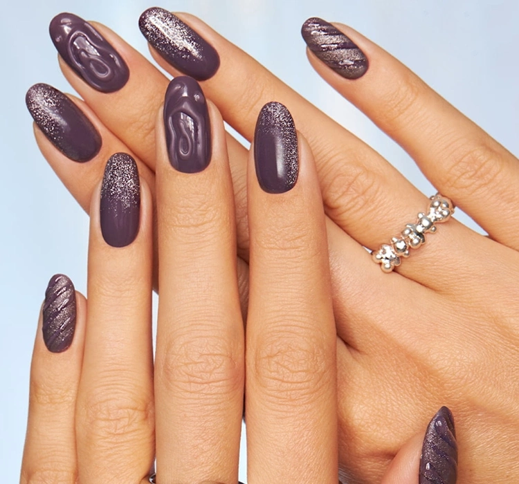 3. Vor der Anwendung die Flasche in den Händen rollen (damit sich die Metallpartikel gleichmäßig verteilen). Dann eine sehr dünne Schicht des Lacks in der gewünschten Farbe auftragen und unter LED-/UV-Lampe aushärten. Für intensivere Farbwirkung den Schritt wiederholen.