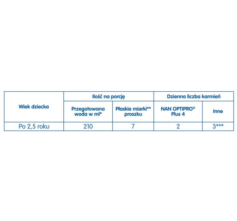** Verwenden Sie ausschließlich den beiliegenden Messlöffel. Die Verwendung einer größeren oder geringeren Menge als angegeben kann zu Dehydrierung oder Mangelernährung führen. Ändern Sie das Mischungsverhältnis nicht ohne Rücksprache mit dem Arzt. *** NAN OPTIPRO® Plus 4 ist nur ein Bestandteil einer gesunden Ernährung nach dem 2. Lebensjahr.