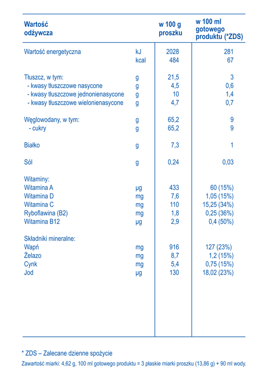 Ingredients: Vollmilch (48%), Magermilch (25%), Laktose (aus Milch), Maltodextrin, pflanzliche Öle (Rapsöl, Sonnenblumenöl), Molkenpermeat (aus Milch), Calciumcitrat, Säureregulator (Kaliumphosphate), Emulgator [Lecithine (aus Soja)], Calciumcarbonat, Vitamine (C, B2, B1, A, Biotin, D, B12), 2'-Fucosyllactose (2'-FL) (enthält Laktose), Eisensulfat (II), Bakterienkulturen Limosilactobacillus reuteri1, Zinksulfat, Antioxidantien (Mischung aus Tocopherolen, L-Ascorbylpalmitat), Kaliumjodid.