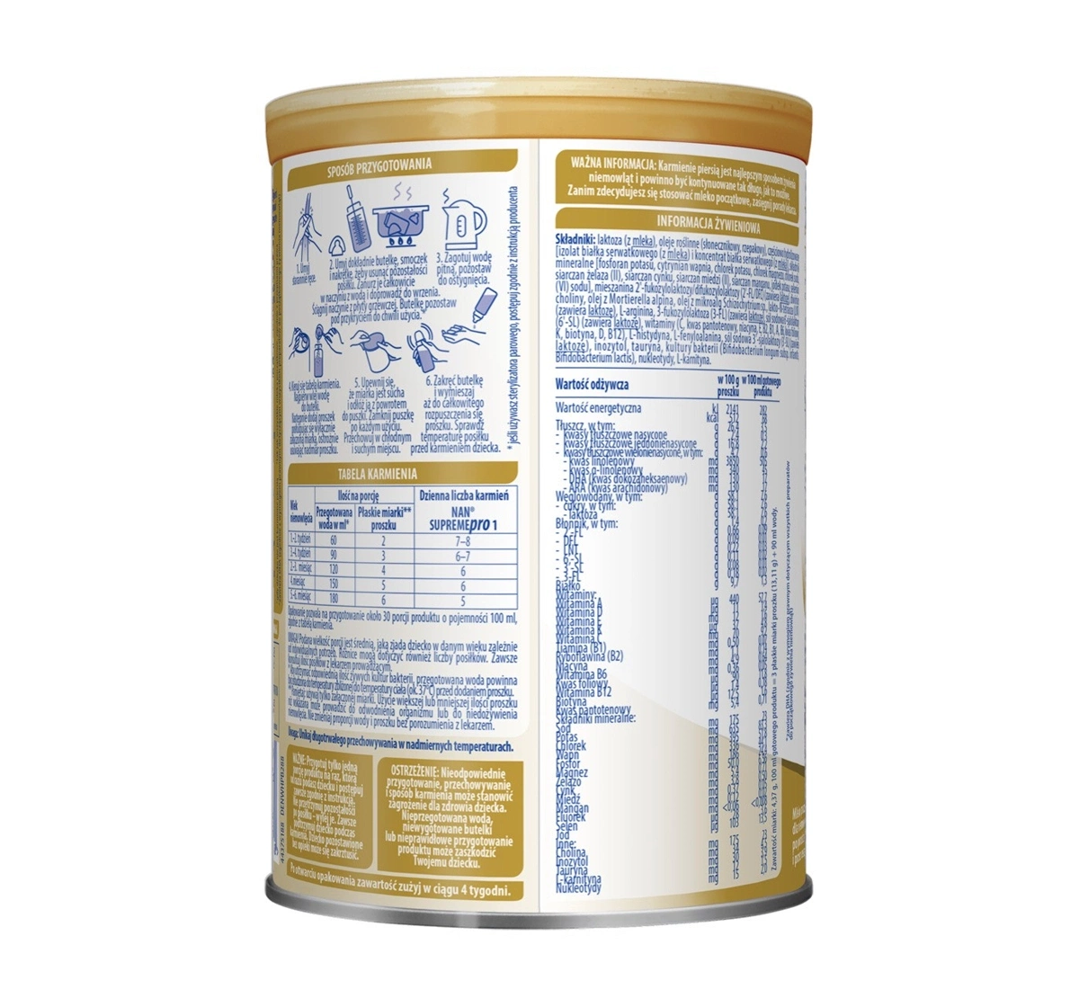 Nestlé NAN Supreme Pro 1 enthält HMO (Muttermilch-Oligosaccharide), DHA sowie Probiotika, die das Immunsystem stärken und die gesunde Funktion des Verdauungssystems unterstützen. Das OPTIPRO-Protein, das einem einzigartigen Hydrolysierungsprozess unterzogen wurde, sorgt dafür, dass die Zusammensetzung besonders sanft für den empfindlichen Magen des Säuglings ist. Der Verzicht auf Palmöl und die Verwendung ausgewählter Nährstoffe fördern eine gesunde Entwicklung des Kindes in den ersten Lebensmonaten.