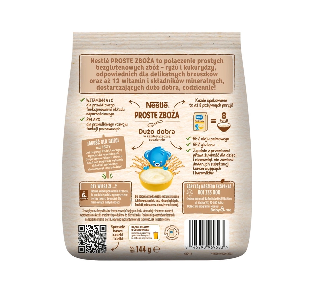 Die Formeln der Nestlé Proste Zboża Breie basieren auf natürlichen Zutaten, die reich an Vitaminen und Mineralstoffen sind und die gesunde Entwicklung des Kindes unterstützen. Die Vitamine A und C stärken das Immunsystem, während Eisen die Entwicklung der kognitiven Fähigkeiten fördert. Die Breie sind leicht verdaulich, enthalten keinen Zucker, kein Palmöl und kein Gluten, was sie zu einer sicheren Wahl für empfindliche Bäuchlein macht.