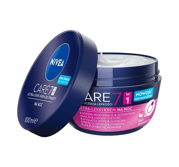 Die leichte Nachtcreme NIVEA Care 5in1 ist für alle Hauttypen geeignet, einschließlich trockener und empfindlicher Haut. Die speziell entwickelte Rezeptur enthält eine ideale Kombination aktiver Inhaltsstoffe, die das Hautbild sichtbar verbessern und ihre Gesundheit unterstützen.