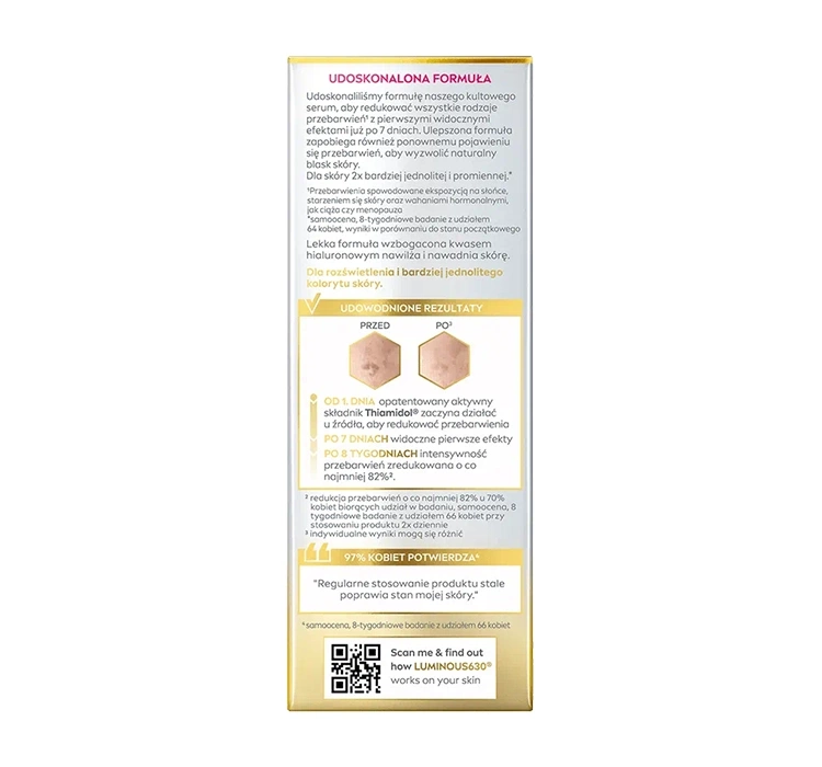 Serum gegen Verfärbungen Luminous 630 ist ein einzigartiges Produkt, das sehr wirkungsvoll beim Beseitigen der Verfärbungen ist. Das Produkt hellt nicht nur bestehende Verfärbungen auf der Haut auf, sondern beugt auch wirksam der Entstehung neuer Verfärbungen vor. Alles ist dem wunderbaren Stoff Luminous 630 zu verdanken, dessen erste Resultate schon nach 4 Wochen der Anwendung zu merken sind.