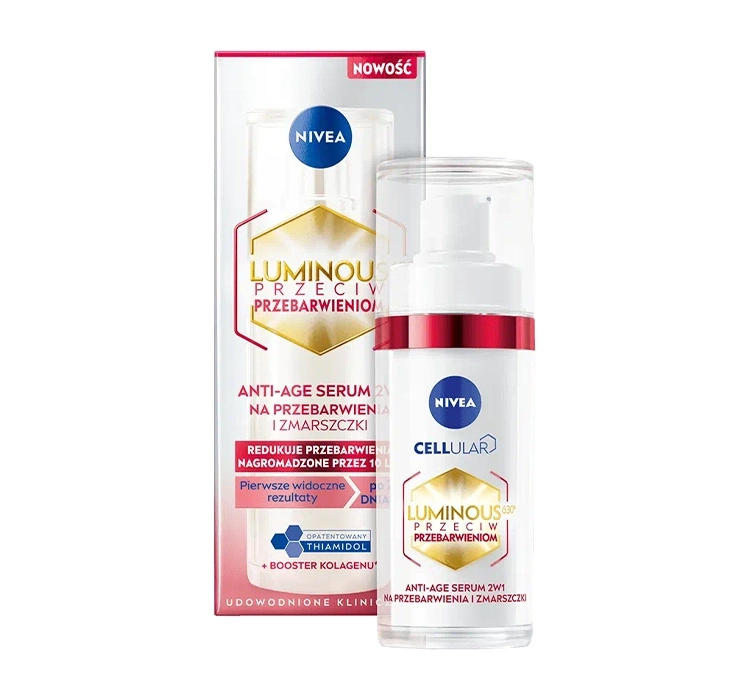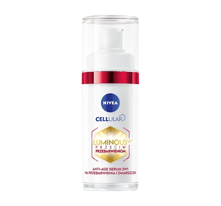 Das Anti-Aging 2-in-1 Serum aus der Cellular Luminous 630 Kollektion von Nivea ist ein Produkt, das mühelos Pigmentflecken, die in den letzten 10 Jahren entstanden sind, reduziert und eine makellose Haut ohne Unreinheiten garantiert. Es gleicht die Pigmentierung auf zellulärer Ebene aus und verhindert die erneute Entstehung von Pigmentflecken. Die ersten Ergebnisse der Anwendung des Anti-Aging 2-in-1 Serums sind bereits nach 2 Wochen sichtbar! Das Serum Cellular Luminous 630 wirkt gegen Falten - es strafft die Haut hervorragend, stellt ihre Dichte wieder her und füllt selbst tiefe Falten, wodurch der jugendliche Look der Haut zurückgegeben wird.