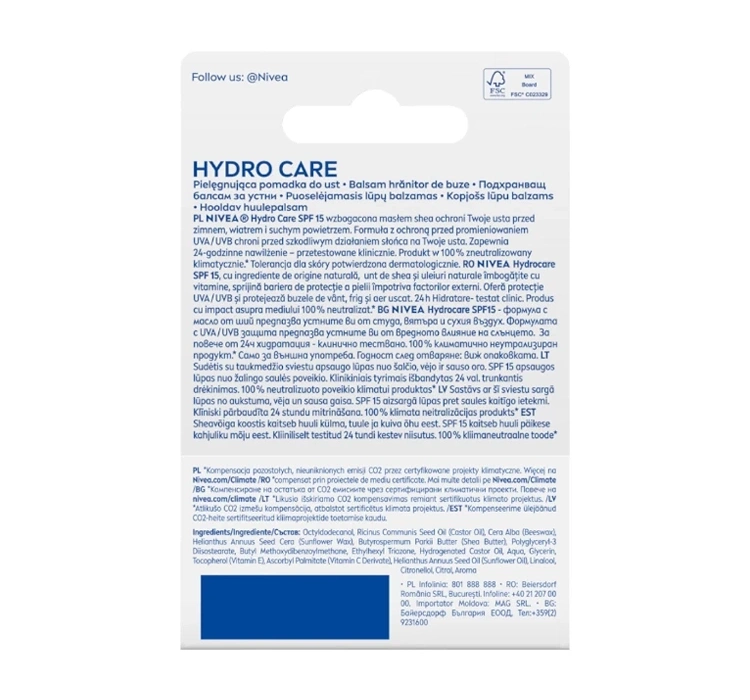 Die verbesserte Formel der NIVEA® Pflegelippenstifte wurde für deine schönen Lippen und unsere gemeinsame Umgebung geschaffen. Sie enthält natürliche Inhaltsstoffe wie Sheabutter, Jojobaöl und Avocadoöl. Die Verpackung der Lippenstifte ist recycelbar!