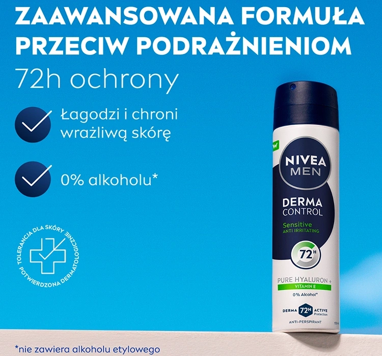 NIVEA MEN Derma Control Sensitive ist ein Antitranspirant-Spray, das speziell für Männer mit empfindlicher Haut entwickelt wurde, die nicht nur zuverlässigen Schutz vor Schweiß, sondern auch umfassende Pflege erwarten. Bietet bis zu 72 Stunden Antitranspirant-Schutz und ist somit ideal für körperlich aktive Männer, Arbeiten unter anspruchsvollen Bedingungen oder alle, die ein langanhaltendes Frischegefühl benötigen. Die sanfte, aber effektive Formel wurde für den täglichen Komfort und zuverlässigen Schutz in jeder Situation entwickelt.