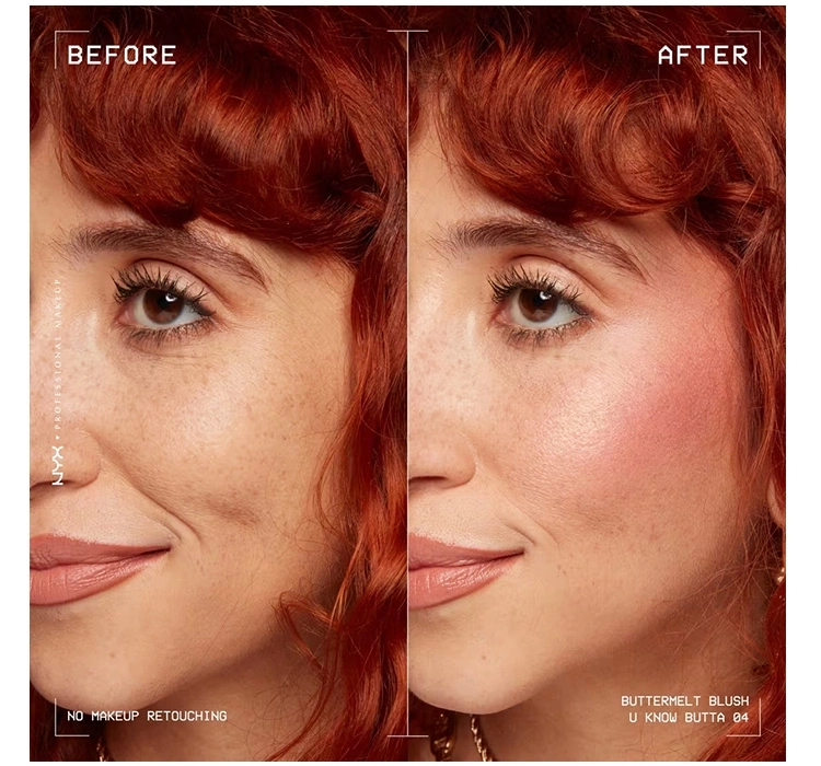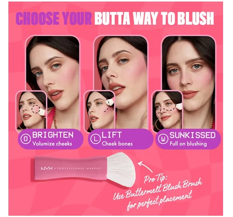 Der Buttermelt Blush von NYX Professional Makeup hat eine gepresste Konsistenz im Kompakt, die sich wie Puder aufträgt, aber so weich wie Butter ist, wodurch er sich perfekt verblenden lässt. Er lässt sich äußerst leicht auf der Haut verteilen und hinterlässt eine ideale Wolke von Farbe und einen natürlich aussehenden Teint. Habe Spaß am Make-up, je nach Gesichtsform und Erwartungen, trage den Buttermelt Blush in L-Form (für Lift), in O-Form für einen jugendlichen und frischen Look (Bright), sowie für den trendigen Sunkissed-Look - trage den Blush oberhalb der Wangenknochen und auf dem Nasenrücken auf. Probiere diese Tipps aus!