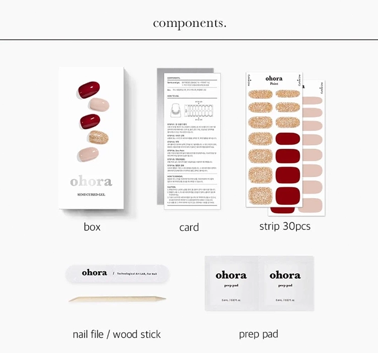 Ein traditionelles Hybrid-Maniküre und -Pediküre, obwohl haltbar, erfordert oft einen zeitaufwändigen Prozess und präzise Arbeit. Die Marke Ohora, als Vorreiter in der Branche, hat sich zum Ziel gesetzt, die Zeit für ein professionelles Nagelstyling zu reduzieren, während Haltbarkeit und Ästhetik erhalten bleiben. So entstand die schnelle UV-Hybrid-Nagelsticker, der Schlüssel zu einem schönen Maniküre, Zeitersparnis und gesunder Nagelplatte. Die Ohora-Nagelsticker bestehen aus drei Schichten traditionellen Hybrid-Lacks, der zu 60% ausgehärtet ist, was sie extrem flexibel macht und sich an verschiedene Formen und Größen der Nagelplatte anpasst.