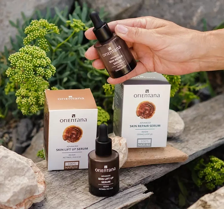 Das Gesichtsserum Orientana Skin Repair ist ein einzigartiges Kosmetikum, angereichert mit Reishi-Pilz und cerafluid®. Der Reishi-Pilz, der als göttlicher Pilz der Unsterblichkeit bezeichnet wird, ist eine wertvolle Quelle von Vitaminen und Mineralien, die sich positiv auf das Aussehen und den Zustand der Haut auswirken. Dieser Inhaltsstoff ist seit Jahren für seine nährenden und verjüngenden Eigenschaften bekannt. Es hat eine Anti-Aging-, feuchtigkeitsspendende und antioxidative Wirkung. Cerafluid® ist ein flüssiges Ceramid, das die Feuchtigkeitsspeicherung verbessert, die Elastizität und Festigkeit der Haut erhöht und das Erscheinungsbild von feinen Linien und Falten reduziert. Das Orientana Skin Repair Serum enthält außerdem stärkendes Beta-Glucan, feuchtigkeitsspendende Trehalose, elastifizierendes Squalan, beruhigende Milchsäure und Anti-Aging-Extrakt aus Purpurreis. Diese Wirkstoffkombination garantiert einen gut genährten, mit Feuchtigkeit versorgten, geglätteten und strahlenden Teint.