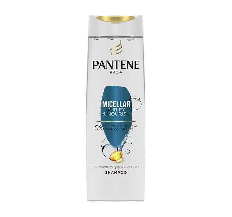 Das Pantene Pro-V Micellar Purify & Nourish Shampoo reinigt sanft fettiges, strapaziertes Haar sowie Haar ohne ausreichendes Volumen. Die effektive Wirkung des Micellar Shampoos basiert auf der innovativen Technologie aktiver Mizellen, die Schmutzpartikel und Sebum anziehen. Dadurch lässt sich die Kopfhaut besser reinigen und das Haar erfrischen. Dank der silikonfreien Rezeptur wird das Haar leicht und fällt natürlich. Die Inhaltsstoffe des Pantene Pro-V Micellar Shampoos für fettiges Haar umfassen:eine Mischung aus Antioxidantien, den Pro-V Inhaltsstoff, den Micellar Complex.