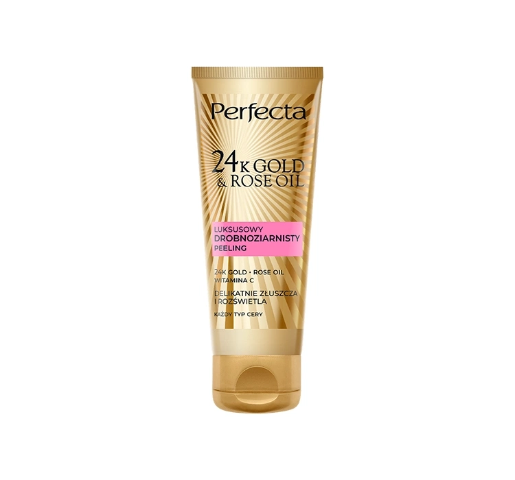Luxuriöses Gesichtspeeling Perfecta 24K Gold & Rose Oil entfernt dank seiner feinkörnigen Formel sanft, aber effektiv abgestorbene Hautzellen, glättet die Hautoberfläche und bereitet sie auf die weiteren Pflegeschritte vor. Nach der Anwendung des feinkörnigen Peelings 24K Gold & Rose Oil wird die Haut glatt, strahlend und frisch, bereit für intensive Feuchtigkeitspflege und Regeneration.