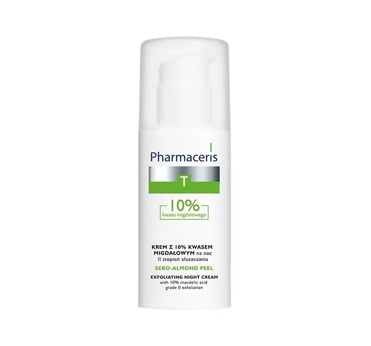 Die Pharmaceris T Sebo-Almond Peel Nachtcreme mit 10% Mandelsäure ist für die tägliche Pflege von zu Akne neigender Haut bestimmt, auch empfindlich, fettig und mit ungleichmäßiger Farbe. Sie kann das ganze Jahr über bedenkenlos angewendet werden, im Sommer empfiehlt sich jedoch die Verwendung einer Creme mit mindestens Lichtschutzfaktor 20.