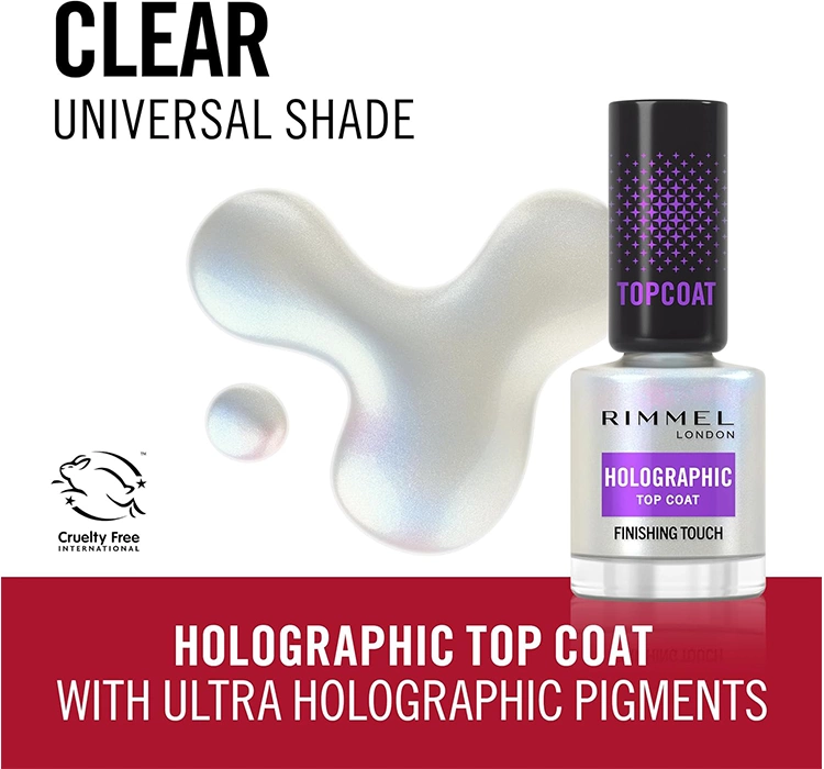 Ob du einen dezenten Glanz oder auffällige holografische Reflexe bevorzugst – der Rimmel Holographic Überlack lässt deine Maniküre aussehen wie frisch aus dem Nagelstudio.