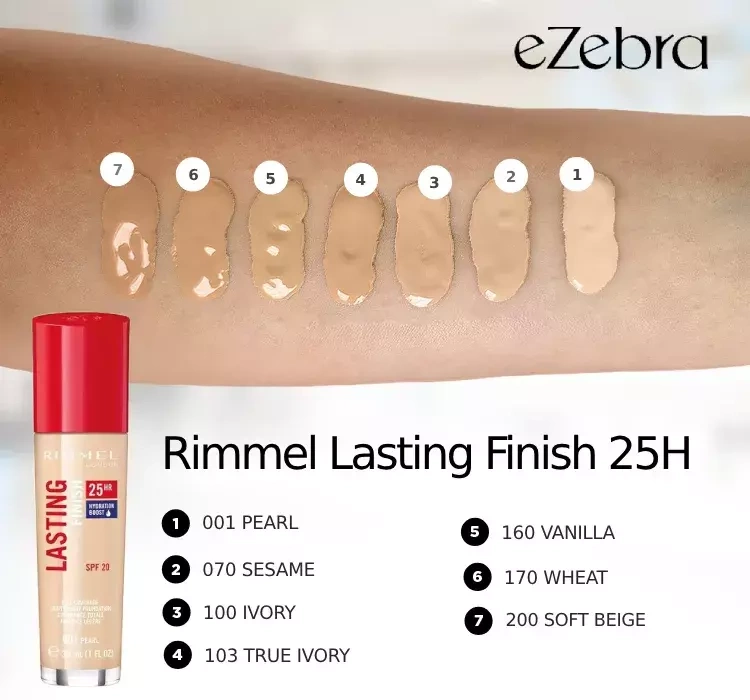 Rimmel Lasting Finish hält bis zu 25 Stunden nach dem Auftragen – selbst bei hoher Luftfeuchtigkeit und hohen Temperaturen. Das in der Formel enthaltene Serum spendet sofortige Feuchtigkeit, und Vitamin E schützt die Haut vor freien Radikalen. Zusätzlich verfügt das Produkt über einen Sonnenschutz SPF 20, der vor schädlichen Umwelteinflüssen schützt.