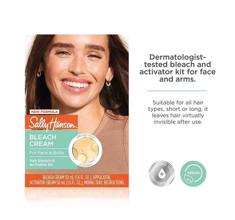 • Sally Hansen Extra Strength Crème Hair Bleach ist ein Set zur Aufhellung von Haaren im Gesicht und am Körper.