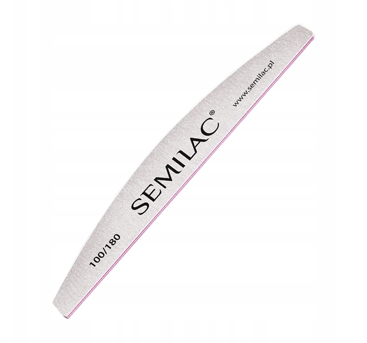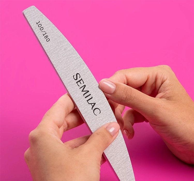 Die Semilac-Feile hat auch zwei Abstufungen. Auf der einen Seite findest du eine feinkörnige Seite mit einer Abstufung von 180, auf der anderen eine mittelkörnige mit einer Körnung von 100. Dank ihr kannst du deine natürlichen und verlängerten Nägel kürzen und stilisieren.