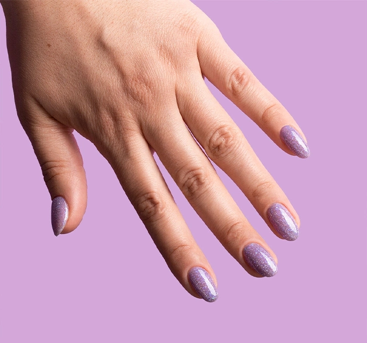 Trage eine dünne Schicht des Lacks auf die ausgehärtete Schicht der Hybrid-Basis auf und härte sie mit einer UV-LED-Lampe aus. Nicht direkt auf die Nagelplatte auftragen. Wiederhole den Auftrag, um das gewünschte Farbergebnis zu erzielen. Beende die Maniküre mit einer Schicht Top Coat und härte diesen ebenfalls aus.