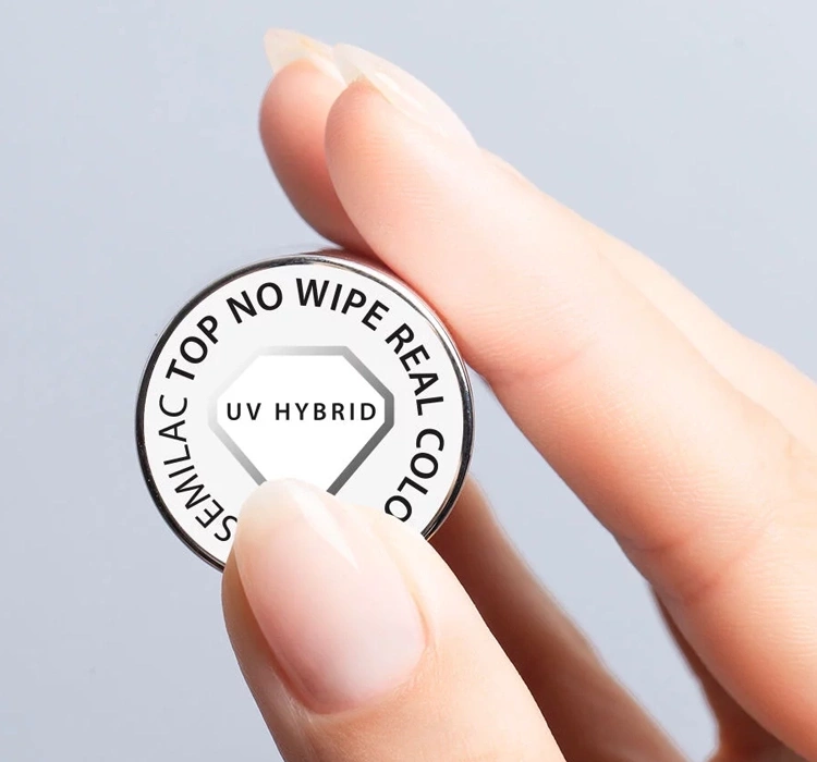 Semilac Top No Wipe verleiht der Maniküre mit nur einer aufgetragenen Schich ein ausdrucksstarkes, glänzendes Finish. Er ist ein Decklack für Hybridlacke, der keine Dispersionsschicht hat und daher keine Reinigung mit einem Reiniger erfordert.
