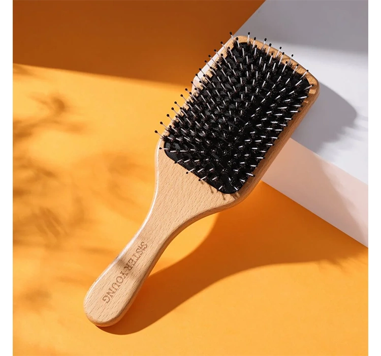 Die breite, rechteckige Paddle-Bürste Sister Young Vera BV zeichnet sich durch eine große, flache Oberfläche aus, die es ermöglicht, eine größere Menge Haare schnell zu entwirren. Ihre weit auseinander stehenden Borsten, die aus einer Kombination von Nylon und Wildschweinborsten bestehen, entwirren die Haare sanft und effektiv, ohne sie zu beschädigen. Die Nylon-Zähnchen, die an kleinen Kugeln enden, massieren die Kopfhaut und stimulieren die Durchblutung, was zur Verbesserung der Haar-Gesundheit und ihrem schnelleren Wachstum beiträgt. Gleichzeitig dämpft das elastische Polster der Vera Bürste von Sister Young den Druck und sorgt für außergewöhnlichen Komfort bei der Anwendung.
