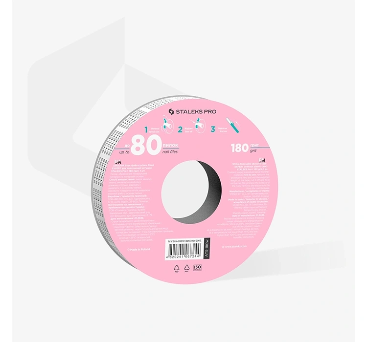 Staleks Pro Bobbinail Expert Schleifband ist eine fortschrittliche Lösung für Profis, die maximale Hygiene mit Komfort und Wirtschaftlichkeit kombiniert. Es handelt sich um wechselbare Einwegauflagen in Form eines auf einer Rolle gewickelten Bands, entwickelt für die Nutzung mit wiederverwendbaren Staleks Pro Basis-Feilen (kompatibel mit MBE-20, MBE-20s, SPBE-20, SPBE-20s). Der Hauptvorteil ist die zuverlässige selbstklebende Unterlage, die ein perfektes Anhaften auf der Basis gewährleistet und Bewegungen oder Falten während der Arbeit verhindert. Ein unverzichtbares Zubehör für jedes professionelle Maniküre- und Pediküre-Set, bei dem Präzision und Sicherheit zählen.