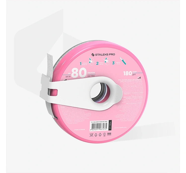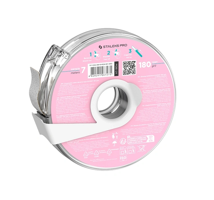 Staleks Pro Bobbinail Expert Schleifband ist eine fortschrittliche Lösung für Profis, die maximale Hygiene mit Komfort und Wirtschaftlichkeit kombiniert. Es handelt sich um wechselbare Einwegauflagen in Form eines auf einer Rolle gewickelten Bands, entwickelt für die Nutzung mit wiederverwendbaren Staleks Pro Basis-Feilen (kompatibel mit MBE-20, MBE-20s, SPBE-20, SPBE-20s). Der Hauptvorteil ist die zuverlässige selbstklebende Unterlage, die ein perfektes Anhaften auf der Basis gewährleistet und Bewegungen oder Falten während der Arbeit verhindert. Ein unverzichtbares Zubehör für jedes professionelle Maniküre- und Pediküre-Set, bei dem Präzision und Sicherheit zählen.