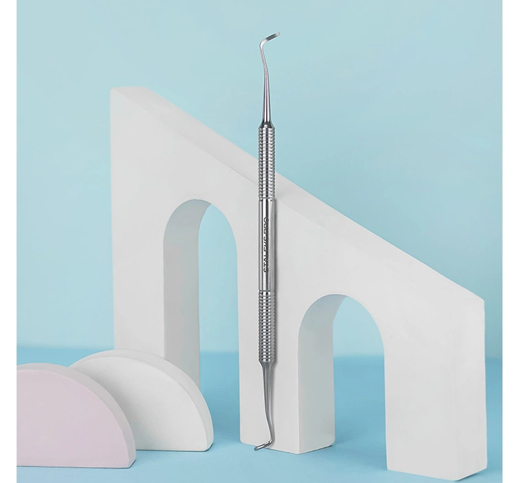 Die podologische Sonde Staleks PRO PODO10 verfügt über zwei identische Arbeitsspitzen. Dieses Werkzeug ist hilfreich bei der Applikation von Tamponaden, der Behandlung von eingewachsenen und eingerollten Nägeln sowie bei der Reinigung der Nagelränder. Die dünnen, gebogenen Spitzen der Sonde können auch für eine schonende Reinigung und Entfernung von abgestorbener Haut und Hornhaut verwendet werden.