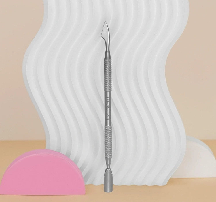 • Staleks Pro Smart Pusher zur Maniküre 50/2 ist ein zweiseitiges Werkzeug mit abgerundeter Spitze und Axt, das ein präzises Abheben der Nagelhaut und Reinigen der Nagelplatte ermöglicht.