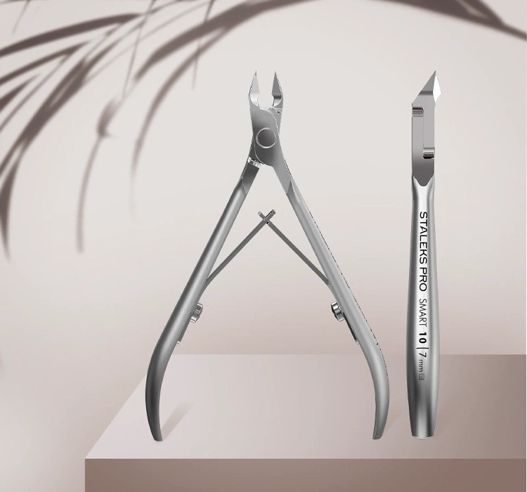 Die Konstruktion der Staleks Pro Smart 10 besteht aus hochlegiertem Edelstahl, der manuell geschliffen und mit GOI-Paste poliert wurde, wodurch Korrosionsbeständigkeit und Langlebigkeit des Werkzeugs erhöht werden. Die doppelte Feder sorgt für gleichmäßige, sanfte Bewegungen der Schneiden, und das sorgfältig polierte Gelenk gewährleistet präzises Öffnen ohne Haken. Die satinierte Oberfläche der Staleks Nagelhautzangen verleiht ein elegantes Aussehen und angenehme Haptik während der Arbeit.
