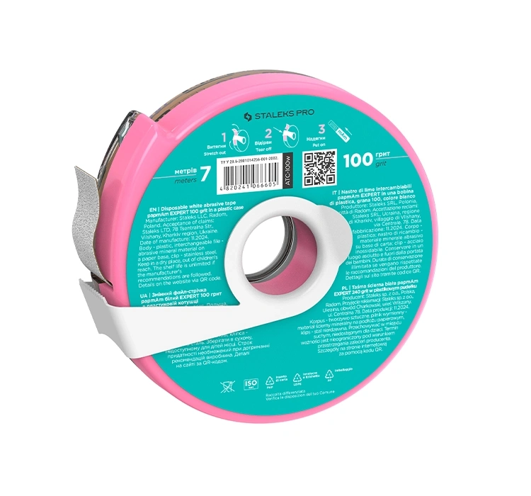 Weißes Schleifband papmAm Expert in Kunststoffbox Staleks Pro ist eine innovative Lösung in Form von wechselbaren Einwegauflagen auf Rolle, speziell entwickelt für sicheres und hygienisches Maniküre- und Pediküre-Arbeiten. Die papmAm-Auflagen werden wie eine Schutzhülle auf die Feilenbasis aufgesetzt und schützen diese vollständig vor Haut- und Nagelkontakt des Kunden. Das Schleifband besteht aus Kraftpapier und zeichnet sich durch sichere, weiche Enden aus, die ein versehentliches Schneiden des Kunden verhindern. Das Band erlaubt individuelles Abmessen und Zuschneiden auf die optimale Länge.