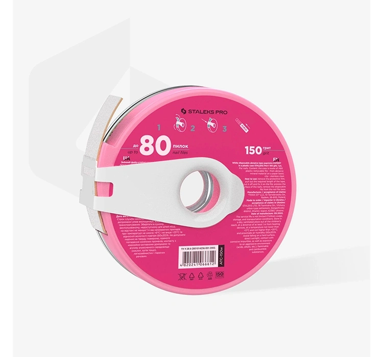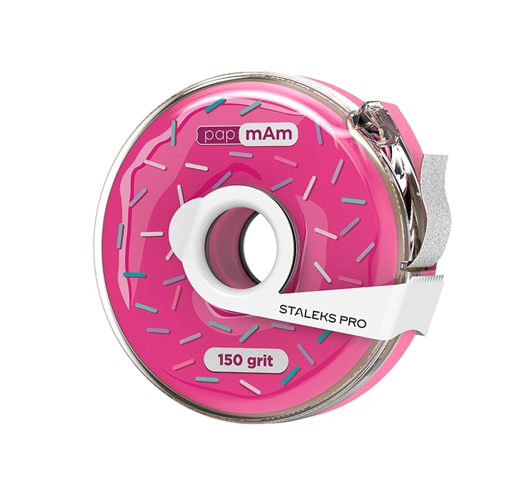 Weiße Schleifband papmAm Expert in Kunststoffbox Staleks Pro ist eine innovative, wiederverwendbare Einweg-Auflagen in Form eines Bandes auf einer Kunststoffrolle, entwickelt für eine sichere und hygienische Maniküre und Pediküre. Die papmAm-Auflagen werden wie eine Schutzhülle auf die Feilenbasis aufgezogen und schützen diese vollständig vor dem Kontakt mit Haut und Nägeln des Kunden. Das Schleifband besteht aus Kraftpapier, und die Auflagen zeichnen sich durch sichere, weiche Enden aus, die effektiv das Risiko von Schnittverletzungen des Kunden mit der Feile während der Arbeit verhindern. Das Band ermöglicht das selbstständige Abmessen und Zuschneiden der Auflage auf eine optimale, individuell angepasste Länge.