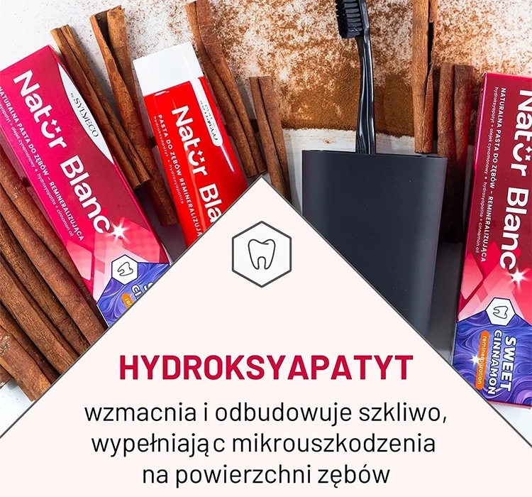 Sylveco Natur Blanc Sweet Cinnamon ist eine remineralisierende Zahnpasta, die speziell für Menschen mit empfindlichen Zähnen und geschwächtem Zahnschmelz entwickelt wurde. Ihre natürliche Formel stärkt die Zähne, schützt vor Karies und unterstützt die Gesundheit des Zahnfleisches. Hydroxyapatit, ein zentraler Bestandteil der Zahnpasta, regeneriert den Zahnschmelz effektiv und füllt Mikroschäden auf, wodurch der natürliche Schutz der Zähne wiederhergestellt wird. Zimtöl wirkt antibakteriell und erfrischend und beugt Karies vor, während Salbeiöl das Zahnfleisch unterstützt und das Risiko von Reizungen verringert.
