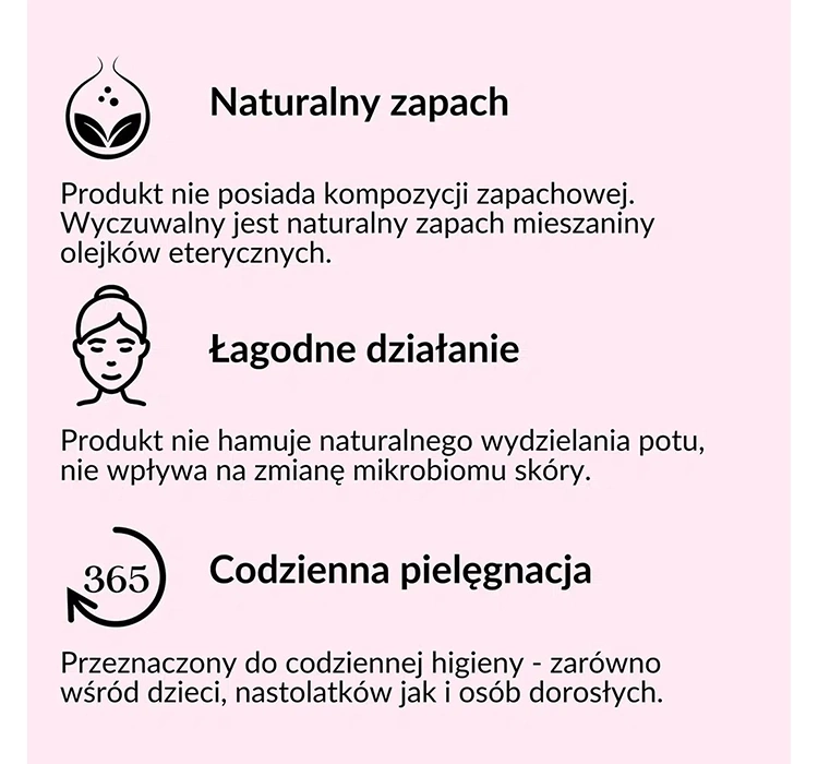 Deodorant ohne Aluminiumsalze und Alkohol, enthält wirksame Inhaltsstoffe, die Schweiß absorbieren und das Wachstum von Bakterien hemmen, gleichzeitig unangenehme Gerüche beseitigen. Extrakt aus Salbeiblättern mit adstringierenden Eigenschaften sowie eine Kombination natürlicher ätherischer Öle mit blumigem Duft sorgen für ein langanhaltendes Frische- und Wohlgefühl.