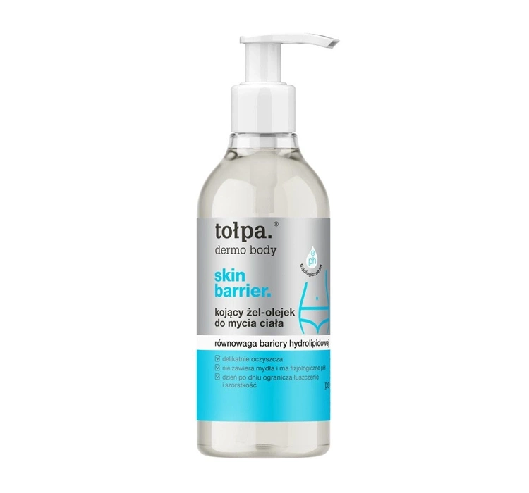 Das beruhigende Duschgel-Öl Tołpa Dermo Body Skin Barrier ist eine sanfte Pflege, die die Haut effektiv reinigt und dabei ihre natürliche Schutzbarriere bewahrt. Dank der seifenfreien Formel und des physiologischen pH-Werts wird die Hydrolipidbarriere nicht gestört, wodurch die Haut weich und geschmeidig bleibt. Es entfernt Verunreinigungen und überschüssigen Talg ohne auszutrocknen und ist somit die ideale Wahl für empfindliche und beruhigungsbedürftige Haut.