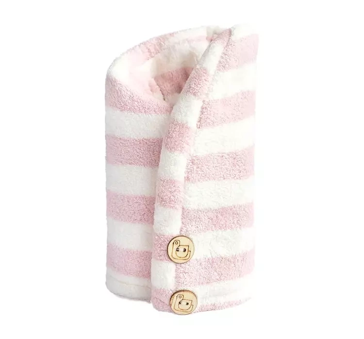 Das Handtuch hat ein ansprechendes Design. Rosa-weiße Streifen mit niedlichen Knöpfen werden jeder Haarliebhaberin gefallen. Kümmere dich um dein Haar mit den Produkten der polnischen Marke Trust My Sister!