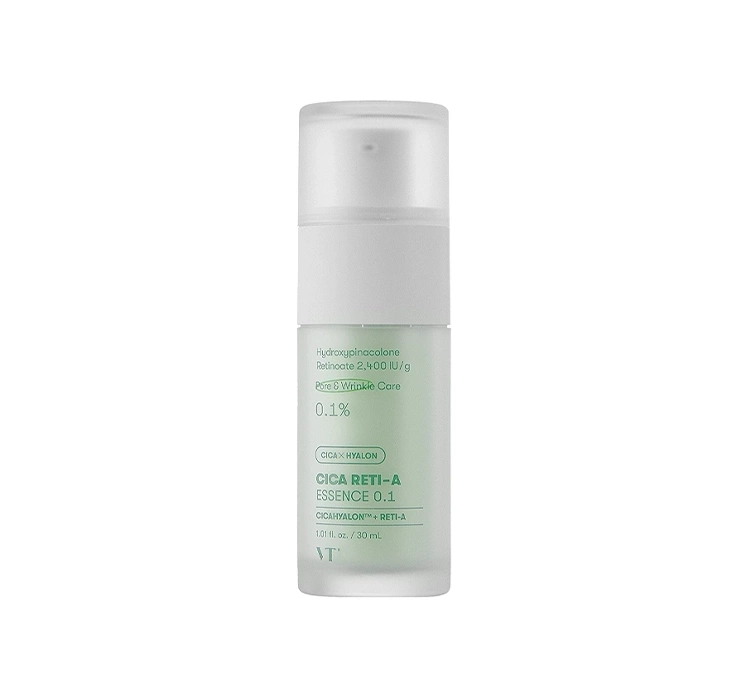 Die VT Cosmetics Cica Reti-A Essence 0,1% basiert auf einem Retinoid der neuen Generation, das stark anti-aging wirkt, Mimikfalten und Pigmentflecken reduziert. Die Formel enthält außerdem Retinol, Bakuchiol und Adenosin, die gemeinsam die Hautstraffung unterstützen, die Elastizität und Regeneration der Haut fördern. Der CICA-Komplex aus Centella Asiatica Extrakt beruhigt Irritationen, lindert Entzündungen und unterstützt den Wiederaufbau der Hautbarriere. Zusätzlich gleicht Niacinamid den Hautton aus, verfeinert Poren und reguliert die Talgproduktion, während Lipo-Hydroxy-Säure (LHA) die Hauterneuerung stimuliert, Mitesser reduziert und die Haut glättet.