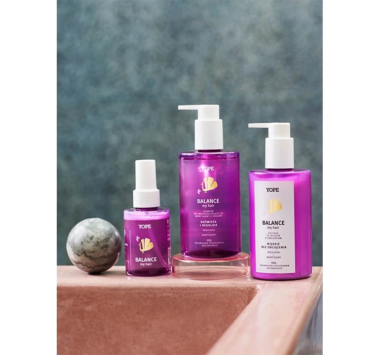 YOPE BOUNCE my hair ist eine innovative Serie für die tägliche Pflege aller Haartypen. Die darin enthaltenen Produktfamilien HYDRATE my hair, BALANCE my hair und BOOST my hair gehen auf unterschiedliche Bedürfnisse ein, die du ganz nach deinen Vorlieben kombinieren kannst. Auf diese Weise erhältst du eine umfassende Pflegebehandlung für die Strähnen, von der richtigen Reinigung der Kopfhaut über die Pflege der Haare bis hin zu den Spitzen.