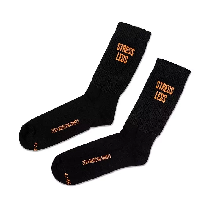 Die ZEW For Men x Warsaw Saints Stress Less Socken sind ein limitiertes Produkt, das speziell für diesen besonderen Anlass entwickelt wurde. Sie haben eine klassische schwarze Farbe mit orangefarbenen Accessoires. Sie wurden aus sehr weichem und bequemem Frottee in Polen hergestellt. Die Zusammensetzung enthält bis zu 80% hochwertige Baumwolle. Sie sind in einer universellen Herrengröße von 42-45 erhältlich.